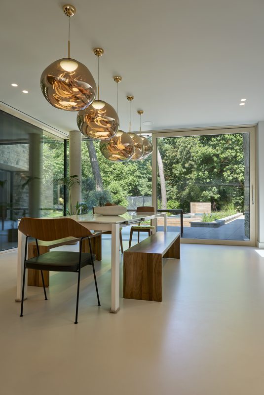 Where once stood a modest chalet bungalow, now rises a contemporary masterpiece defined by clean architectural lines, expansive glazing, and an enduring connection to the landscape. Every detail – from the structural form and finishes, to the sight lines of the windows — was carefully considered to create a home that feels effortless yet deeply sophisticated.